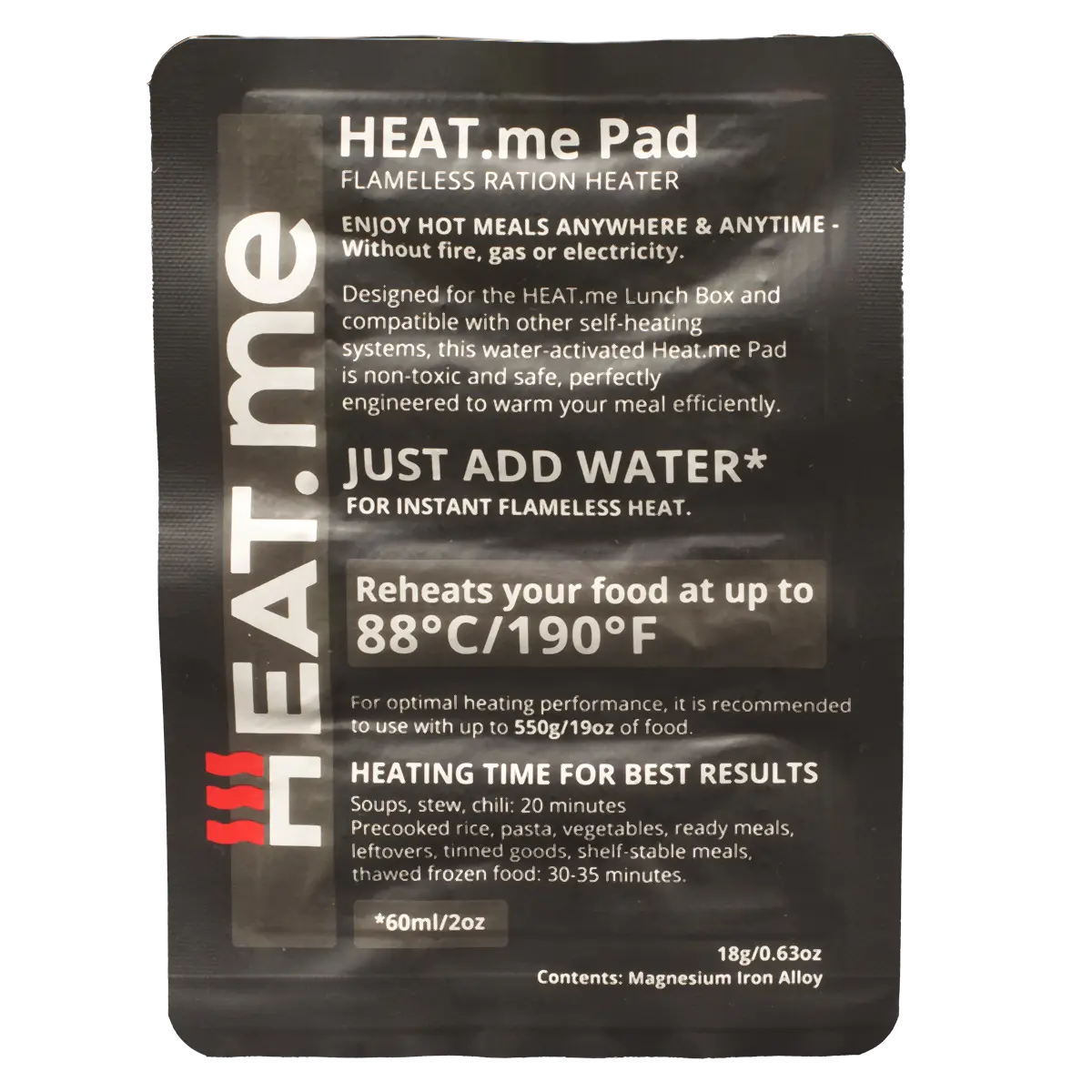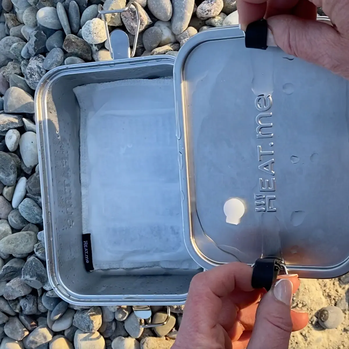 Das Erhitzen deines Essens ist einfach und erfolgt in wenigen Schritten: Zuerst legst du ein HEAT.me Heizpad (mit Schutzhülle) auf den Boden deiner Lunchbox (z.B. der Premium Lunchbox oder der GRILL & CHILL Lunchbox). Gieße dann 60ml Wasser aus der Dosierflasche über das Heizpad und platziere anschließend deine befüllte 800ml Premium Lunchbox direkt darauf. Zum Schluss verschließt du die Lunchbox.